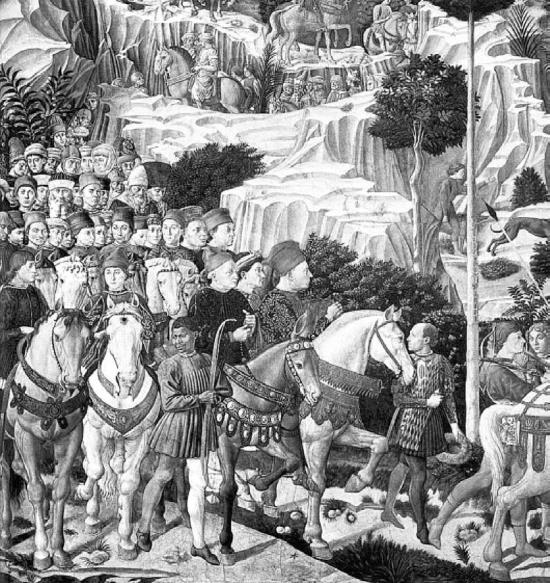 Герцог Галеаццо Мария Сфорца (?) на фреске Беноццо Гоццоли «Шествие волхвов». 1459–1460. Капелла Волхвов палаццо Медичи – Рикарди (Флоренция)