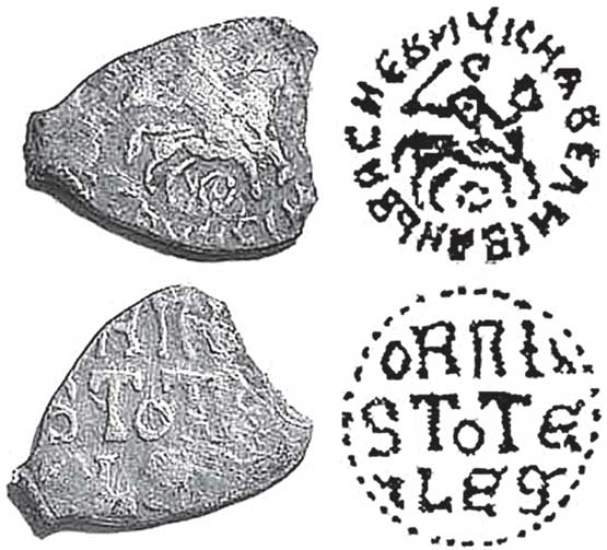 Есть итальянская монета тех же лет: всадник бросает на ветер цветы. Этот ребус разгадан давно и легко: цветы на ветер – fiori al venti. Или, возможно, fiori avanti – …вперед. Фиораванти был, помимо прочего, денежный мастер, едва не фальшивомонетчик: уехав в Москву, он ушел от суда. На обороте монеты-ребуса читаем: «Aristotil».