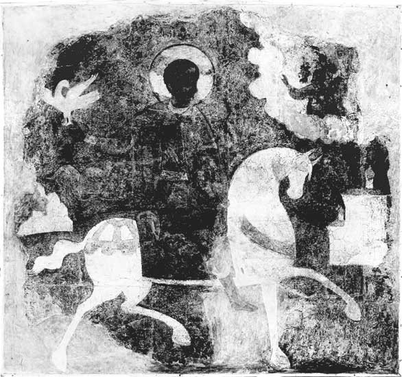 Апсиду церкви украшала наружная фреска, снятая в музей: мученик Трифон на белом коне с белым кречетом на отведенной руке. Это один из русских изводов иконографии святого Трифона, изображаемого также в рост или в полроста, но непременно с птицей на руке. (Балканская традиция видит его с виноградным серпом.)
