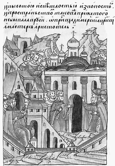 Строительство Успенского собора. Миниатюра Лицевого летописного свода. В центре, предположительно, Аристотель Фиораванти