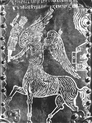 Китоврас мечет братом своим <Соломоном>. Клеймо кованых врат из Новгородского Софийского собора, перенесенных в собор Александровой слободы