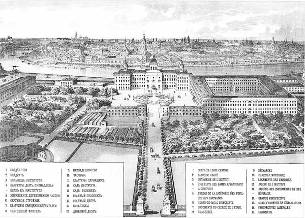 Во всяком случае, проста наружность прообраза: симметрия на плане и фасаде, на крыше бельведер, а в прошлом – купола церквей по сторонам него, на половинах мальчиков и девочек. Видно, как трудно классицизму, привычному брать тему целостности и единства, справляться с темой дома-города. Предполагаемый автор проекта Юрий Фельтен и строивший на месте Карл Бланк взяли числом – окон, квадратных и кубических саженей, этажей. Тема далась, но в этой данности обнажена неадекватность языка.