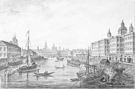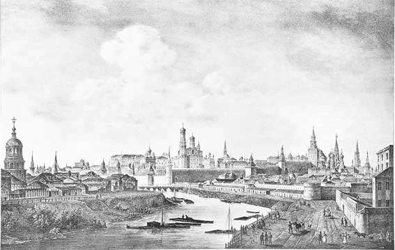 Вид на Кремль и Китай-город. Литография Леметра по рисунку О.-А. Кадоля. 1825. У левого края – церковь Николы Заяицкого, у правого – ограда Воспитательного дома