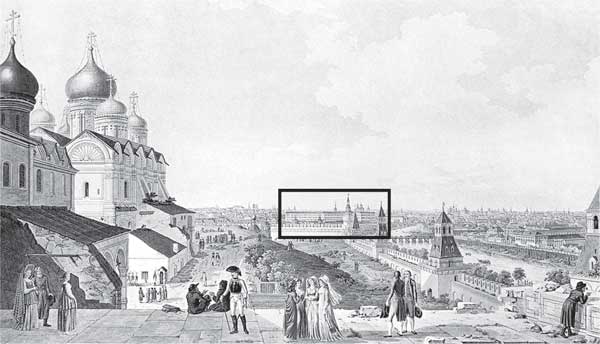 Вид на Москву с балкона Кремлевского дворца в сторону Москворецкого моста. Гравюра с оригинала Ж. Делабарта. 1790-е. Фрагмент. В глубине – Воспитательный дом, каким его увидит с этого места Наполеон