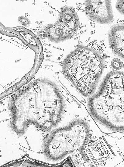 Дж. Б. Пиранези. Античный Рим. План. 1757. Фрагмент. Внизу – Авентин, в центре – Палатин, вверху – Капитолий