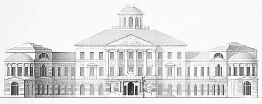 Однако память места еще два столетия сопротивлялась петербургскому проекту: восточное крыло осуществилось лишь в советскую эпоху. Пожалуй, бельведер над центром дома наследует угольной башне белых стен. Но и переступание черты могло отговориться местной памятью, древнейшей памятью единого Васильевского луга, обращенного теперь в единый дом.