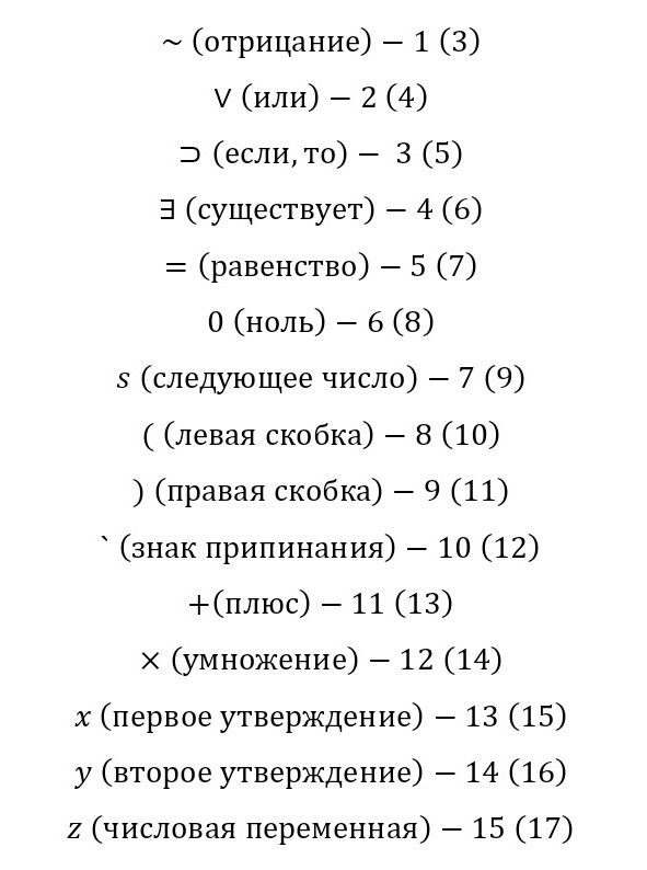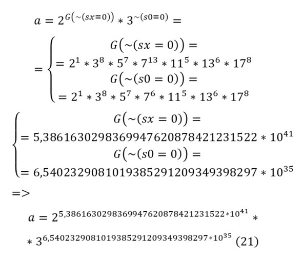 Но если потратить на каждый знак числа, то для самих чисел, к примеру для 0 присваивается цифра – 6, а если написать 1, пишется «s0», что значит «следующее за 0», для 2 – ss0 и так можно выразить любое целое число, хоть и громоздко. Итак, если для обозначения и чисел ввели показатели, то можно записать и уравнения, к примеру «0=0», эти значениям присваиваются цифры 6, 5, 6, соответственно, но для уравнения «0=0», можно создать свою карточку, взять простые числа с 2 и они возводятся в степень числа элемента по системе Гёделя, а затем они перемножаются.