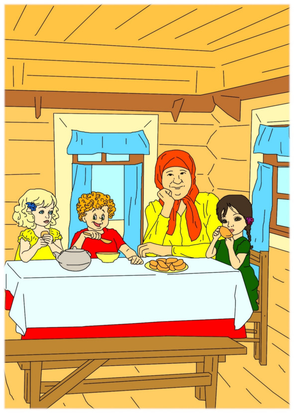 When Lusia and the Wonder-boy entered the house, Baba Mania and Dusia were sitting at the table, drinking tea and eating pancakes.
