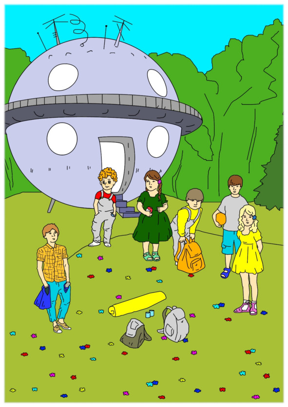 The boys ran to the forest, to the meadow. They were impatient to see an alien ship. The cosmos was like a big balloon, with round porters all over the ship’s diameter. It was made of durable silver-coloured metal. On the roof were installed several wires sticking up, in the form of antennas. Under the rays of the scorching sun Cosmolet shone brightly and shambled. The boys climbed inside the ship to inspect his device.