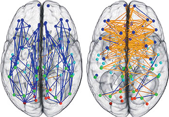 На представленном рисунке схема, полученная учёными, из неё видно, что у мужчин преобладают связи внутри полушарий (синий цвет), у женщин – между полушариями (оранжевый).
