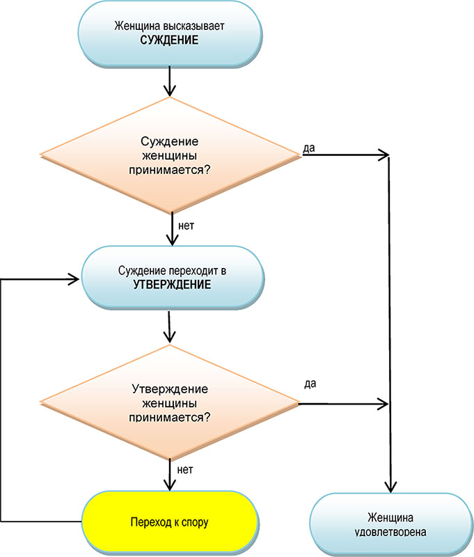 Если не принимается утверждение женщины, то в дальнейшем вас ждёт спор. Причём спор перетекает в утверждение со стороны женщины, и до тех пор, пока вы не согласитесь с утверждением, спор и утверждение будут рекурсивно переходить друг в друга.