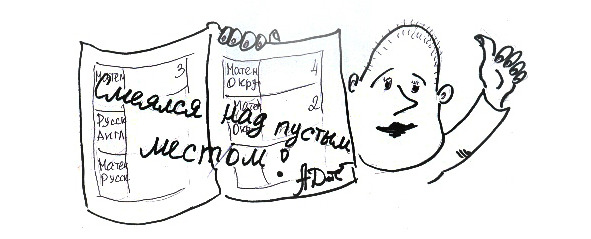 Или те же раскраски. Кто не знает, это такие контурные рисунки, которые следует раскрашивать в указанных границах. Карандашиками или фломастерами. То есть, в яслях или детсадах – понятно, можно давать и эту чепуховину. Но даже моя sister (это сестра по-английски, кто не знает) – и та предпочитает рисовать самостоятельно. Потому что вся в брата. А брат, между прочим, эти малышовые раскраски даже в глубоком детстве в упор не видел. Это я, значит, про себя. За возраст совсем уж груднячковый отвечать не берусь, но лет этак с двух-трех я уже вполне нормально малевал танки, роботов и прочий боевой металлолом. Вовыч, конечно, художник послабее меня, но даже у него глаза на лоб полезли, когда во втором классе мы открыли новые учебники и увидели эти самые раскраски. Автор учебника на полном серьезе предлагал выбирать из пяти тюбиков нужный цвет и возить фломастерам по каким-то зверькам, домикам и машинкам. Естественно, мы начали ржать. Сначала Вовыч, потом я. Или наоборот, не помню. И оба получили записи в дневнике: «Смеялся над пустым местом». То есть, это Аделаида нас распекала: «Над чем смеетесь? Над пустым местом!». Так и записала в дневники. В результате – мы в это «пустое место» неделю без смеха заглядывать не могли. Сразу начинали краснеть и раздуваться.