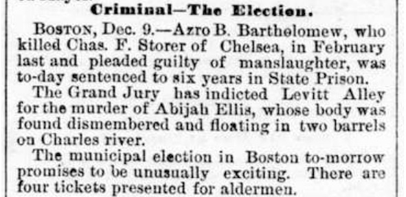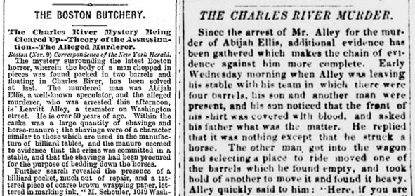 Во второй половине ноября 1872 г. в различных газетах, как Массачусетса, так и других штатов, появилось довольно много публикаций, посвященных расследованию убийства Абии Эллиса. Даже «Большой пожар» Бостона не особенно отвлёк читателей от загадок этой необычной истории. Слева: начало большой статьи с говорящим заголовком «Бостонская бойня» в газете «Chicago daily tribune» от 15 ноября. Справа: статья в «Daily Kennebec journal» в номере от 21 ноября под названием «Убийство на реке Чарльз».