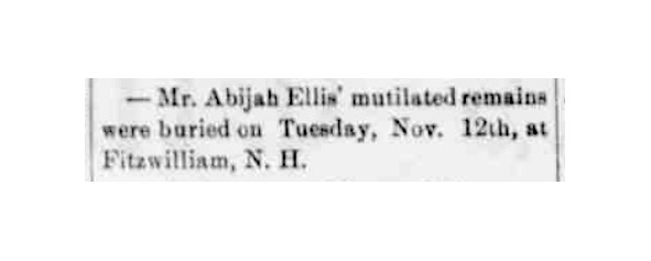 На следующий день Абия Эллис был похоронен в местечке Фрицвилльям (Fitzwilliam) в штате Нью-Гэмпшир. Для этого расчленённые останки пришлось перевезти в закрытом гробу по железной дороге за 80 км от Бостона и далее по просёлочным дорогам доставить на кладбище, на территории которого Эллисы на протяжении нескольких поколений владели большим участком земли.