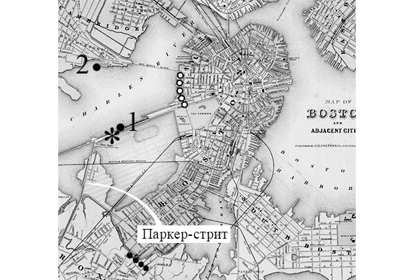 Эта иллюстрация позволяет лучше понять содержание показаний Франклина Рэмселла. Цифра 1 показывает расположение батопорта (герметичных ворот) на Милл-дам, где находился шлагбаум и будка для наряда речной полиции. Цифра 2 обозначает приблизительное место обнаружения бочек с расчлененным трупом у пристани газового завода в Кембридже. Знак * (звёздочка) показывает место на дамбе Милл-дам, где патрульный Джон Перри обнаружил щепки светлого и тёмного дерева. Полицейские считали, что именно там убийца снял бочки с трупом с повозки и столкнул их в воду. Место это было удалено от шлагбаума приблизительно на 60 метров. Чёрный пунктир показывает Ханнеман-стрит, где проживал подозреваемый Левитт Элли. Белый пунктир обозначает Чарльз-ривер-стрит – ту самую улицу, которая первоначально считалась местом сброса бочек в воду. Как видно, показания Рэмселла о встрече с одной и той же повозкой на дамбе и на Паркер-стрит, отлично вписывались в версию о причастности Левитта Элли к убийству Абии Эллиса.