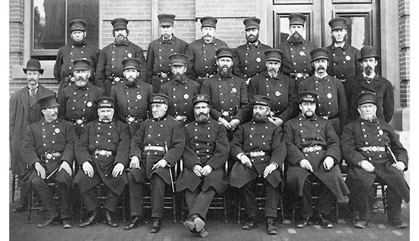 Эти почтенные джентльмены являются сотрудниками той самой 5-й полицейской станции, что обеспечивала защиту законности и поддержание общественного порядка на территории Кембриджа в XIX веке. Точное время фотографирования неизвестно, по наличию 15-дюймовых дубинок, принятых в качестве штатного оснащения в 1878 году, мы можем уверенно датировать снимок, как сделанный не ранее этого года. Различия капитанских и лейтенантских кокард на головных уборах явственно указывают на то, что снимок относится к XIX столетию. С большой вероятностью на этой фотографии присутствуют люди, дававшие показания в ходе судебного процесса, которому посвящен настоящий очерк. К сожалению, у автора нет возможности их идентифицировать, было бы очень интересно каждому из упомянутых в очерке персонажей поставить в соответствие фотопортрет.