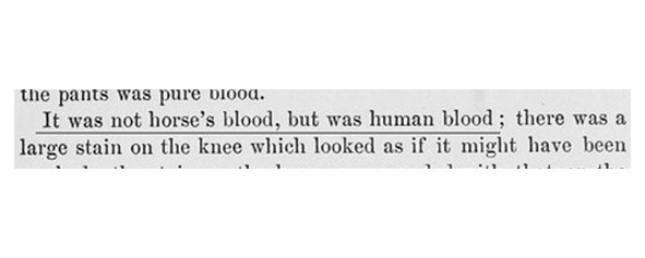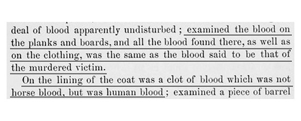 Фрагмент стенограммы судебного заседания: «Это была не лошадиная кровь, но кровь человеческая (…)»! Перед нами яркий пример справедливости знаменитого слогана, гласящего, что иногда лучше жевать, чем говорить… Вплоть до начала XX столетия судебная медицина не располагала методиками, позволявшими отличить лошадиную кровь от человеческой, вот только грамотей Дэйна Хэйс этого пустяка не знал!