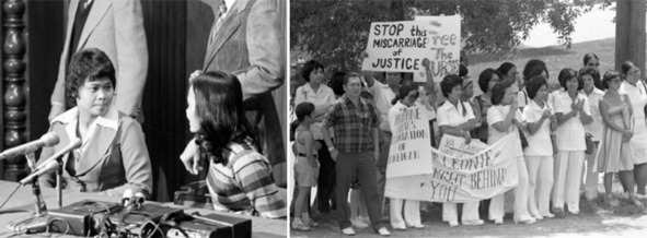 Справа: медсёстры перед пресс-конференцией, на которой рассказали о запугиваниях со стороны Линденауэра, которым якобы подверглись в августе и начале сентября 1975 г. Справа: одна из демонстраций в поддержку Нарсисо и Перез.