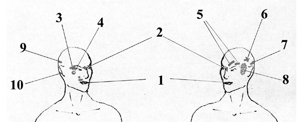 Условная схема травм головы и лица Гленны «Сью» Шарп. Бросается в глаза симметричность распределения причинённых женщине повреждений, что наводит на мысль о действиях переученного левши, одинаково хорошо владеющего обеими руками (амбидекстра).