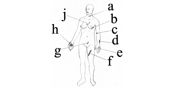 – три однотипных щелевидных разреза кожи, расположенных под одним наклоном и на небольшом участке в области середины груди (поз. «j»). Один из разрезов имел длину 1,5 см и находился на расстоянии 1,2 см правее центральной линии груди и на 7,5 см выше линии сосков, второй при длине 1,2 см располагался в 2,5 см левее центральной линии груди и на 8,5 см выше линии сосков, третий – самый маленький – длиной 0,6 см был расположен точно на центральной линии груди и на 4,5 см выше линии сосков. Ранения эти были непроникающими, поскольку в этом месте расположена т.н. «рукоятка грудины», довольно крепкая кость, к которой крепятся концы ключиц и двух первых пар рёбер. Данные разрезы не представляли серьёзной опасности здоровью, хотя, несомненно, являлись довольно болезненными. По всей видимости, нанесение трёх однотипных неглубоких ранений груди, как и в случае с ранением горла, преследовало цель запугивания жертвы и причинения физических страданий, но не убийства;