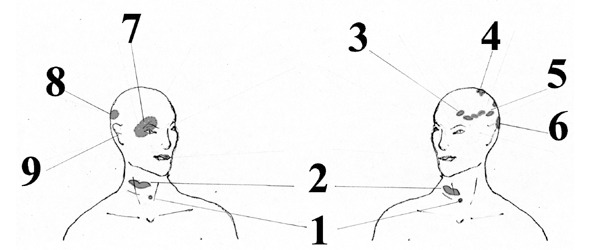 Средняя часть правого уха рассечена – длина разреза достигала 2,0 см. Также рассечена была часть кожи непосредственно за ухом по ходу движения режущего орудия (поз.9 на анатомической схеме). Края рассечения были резко очерчены – это свидетельствовало о том, что в качестве орудия, использованного преступником для этой манипуляции, выступал хорошо заточенный нож. Кроме этого разреза преступник позади правого уха оставил небольшую и неглубокую колотую рану, своеобразный накол кончиком ножа.