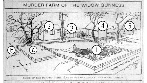 Аксонометрическая схема фермы Белль Ганес из майской газеты 1908 года. Рисунок даёт довольно точное представление о взаимном расположении построек, где «1» – сгоревший жилой дом; «2» – сенной сарай в 2 этажа; «3» – конюшня, в которой, помимо лошадей, находилась коляска для разъездов; «4» – сарай для скотины с птичником; «5» – мастерская. Буквами обозначены: «a» – огород подле жилого дома, «b» – заболоченная лощина к югу от дома, в которой протекал ручей.
