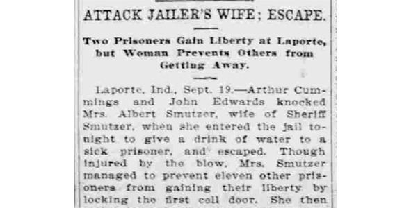 В сентябре 1907 года газета «The Lake County times» сообщила о нападении уголовников, содержавшихся в тюрьме округа Ла-Порт, на жену шерифа и успешном побеге двух нападавших.