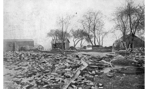 Ферма Белль Ганес после пожара. Вид со стороны сгоревшего жилого дома на надворные постройки.