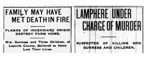 Первые газетные сообщения о событиях, связанных с пожаром на ферме Белль Ганес. Слева: заметка в вечернем выпуске от 28 апреля 1908 г. с лаконичным рассказом об уничтожении жилого дома сильным пламенем и возможной гибели в огне целой семьи. Справа: статья в утреннем номере от 29 апреля, информировавшая читателей о подозрениях в отношении Лэмпхиара, коего власти уже в те часы связывали с гибелью владелицы фермы и её троих детей.