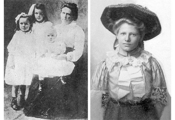 Слева: Белль Бринхилд Соренсон Ганес с родными детьми. Фотография относится к 1906 г., то есть сделана приблизительно за 2—2,5 года до описываемых событий. Справа: Дженни Олсен, падчерица хозяйки фермы. Белль Ганес, показывая эту фотографию соседям, рассказывала, что девочка облачена в школьную форму и сейчас находится на пансионном обучении в Лос-Анджелесе.