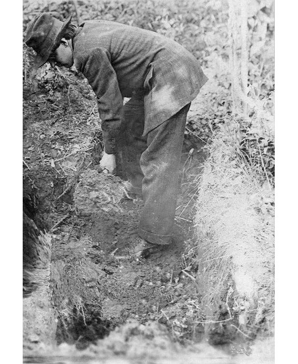 Рабочий во время раскопки одной из ям, указанных Джозефом Мэксоном. Фотография сделана во второй половине дня 6 мая 1908 года.