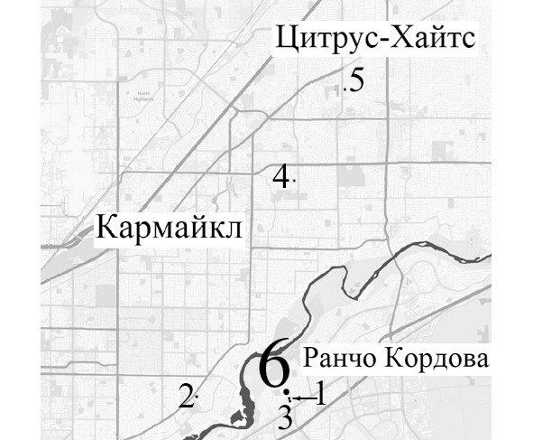 Географическая локализация мест нападений насильника из восточного Сакраменто летом и осенью 1976 г. Условные обозначения: 1—5 – места первых нападений в их хронологической последовательности, 6 – место нападения в ночь на 9 октября в доме на Лас-Касас-вэй в г. Ранчо Кордова. После вылазки в Цитрус-Хайтс несколькими днями ранее преступник вернулся практически в то самое место, откуда начинал свои похождения, и вторгся в дом, расположенный буквально в паре сотен метров от мест прежних нападений.