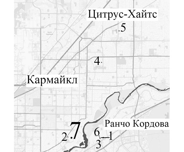 Географическая локализация мест нападений насильника из восточного Сакраменто летом и осенью 1976 г. Условные обозначения: 1—6 — места нападений в их хронологической последовательности, 7 – расположение дома на Киплинг драйв в г. Кармайкл, явившимся местом преступления в ночь на 18 октября 1976 г. Обращает на себя внимание то, что насильник после вылазок в северную часть Кармайкла и в Цитрус-Хайтс (эпизоды 4 и 5) вернулся в районы своей первоначальной активности в районе реки Америкен. Безусловно, эти места являлись его «зоной комфорта» и первоочередной задачей следствия на данном этапе должно было стать выяснение критериев, которыми преступник руководствуется при выборе места очередного посягательства.