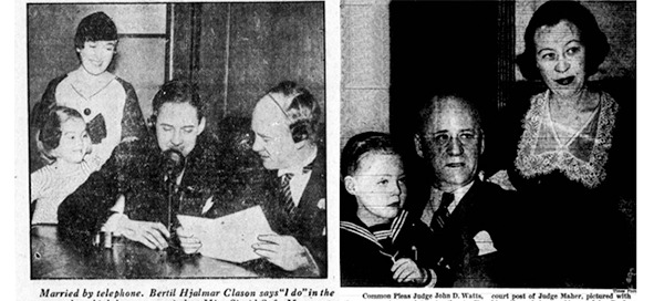 Слева: Джон Уоттс стал известен как первый американский судья, зарегистрировавший брак дистанционно – по телефону. Этому необычному нововведению американская пресса в январе 1934 г. уделила немалое внимание. На фотографии можно видеть, что рядом с женихом, который поднёс к губам мирофон, стоят две сестры невесты, они под присягой подтвердили, что на другом конце провода находится именно Сигрид. Справа: передовой судья сфотографирован в том же году вместе с молодой женой и 4-летним сыном.