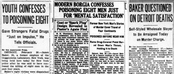 Уже 21 февраля в местных газетах появились первые сообщения о задержании необычного преступника, которого журналисты называли тогда «массовым убийцей» [сейчас это словосочетание используется с другой коннотацией, «массовыми убийцами» называют преступников, совершающих убийства 4-х и более человек в одном месте без перерыва на эмоциональное охлаждение, то есть за одни приём. Если такое преступление совершается в разных местах, то есть преступник перемещается с места на место, то для его обозначения используется термин «цепное убийство»]. Продолжая свои откровения, Джеймс Бейкер сообщил об убийстве посредством отравления неизвестного мужчины в припортовом баре на острове Панай (Филиппинский архипелаг), а также о том, что расправился с отчимом в 1919 г. Отчима он убил выстрелом из ружья, отомстив тем самым за неоднократные побои, изощренное третирование и бесчисленные унижения на протяжении по меньшей мере 4-х лет. По словам Бейкера, именно после этого убийства он пустился в бега, скрылся из Техаса и устроился на корабль юнгой.