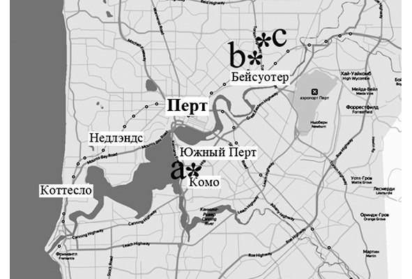 Карта г. Перт и пригородов. Условными обозначениями показаны места, связанные с наездом на Глинис Пик вечером 9 апреля 1960 г: *а – точка угона автомашины «холден» от дома №109 по Гарднер-стрит в Комо, *b – наезда на Глинис Пик у дома №2 по Джон-стрит в Бейсуотере, *с – обнаружения днём 13 апреля в кустах у Бричборо-роад клатча потерпевшей. Полицейские разумно предположили, что злоумышленник после совершения наезда бросил угнанную автомашину, унёс с места ДТП туфлю и сумочку жертвы. От сумочки неизвестный избавился на Бричбро-роад, но её содержимое забрал. Туфелька Глинис Пик найдена так и не была.