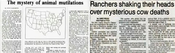 Т.е. не может быть и речи об общенациональном явлении, в любом случае мы видим некие локальные события. В 22 случаях местные органы власти проводили официальные расследования, ветеринары проводили вскрытие туш животных в 11 эпизодах, а в 7 ткани и органы убитого животного изымались для химического анализа. Врачи отметили точность разрезов, нанесенных животным, всего в 4 случаях.
