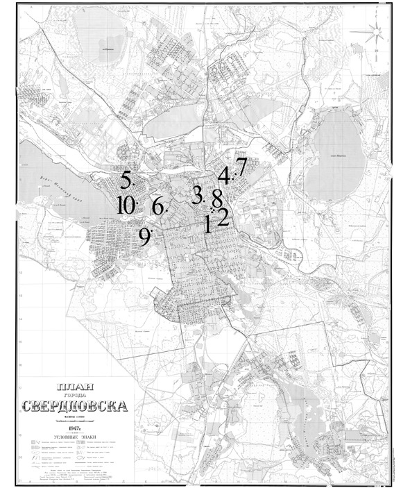 Карта Свердловска с указанием мест исчезновения детей в 1938—1939 г. Черными точками обозначены места: «1» – похищения 12 июля 1938 г. Герды Грибановой, «2» – попытки похищения 10 февраля 1939 г. Бори Титова, «3» – покушения на убийство 1 мая 1939 г. Раи Рахматуллиной, «4» – похищения 12 июня 1939 г. Али Губиной, «5» – похищения 30 июня 1939 г. Риты Ханьжиной, «6» – похищения 22 июля 1939 г. Вали Камаевой, «7» – похищения 27 июля Лиды Сурниной, «8» – похищение 20 августа 1939 г. Ники Савельева, «9» – исчезновение 12 сентября 1939 г. Вовы Петрова и «10» – исчезновение 2 октября 1939 г. Таси Морозовой от дома №22 по ул. Плеханова в поселке Верх-Исетского завода (ВиЗ). Бросается в глаза, что активность похитителя в началу октября 1939 г. была локализована на трёх сравнительно небольших участках – в Сталинском районе (4 эпизода), посёлке ВиЗа (4 эпизода) и в Пионерском посёлке (2 эпизода). Из этого можно было сделать вывод, что преступник в своих действиях руководствуется некоторым лимитом времени, которым может свободно располагать и за границы которого не может выходить. Зная, что похититель молод и вряд ли живёт самостоятельно, органам следствия можно было предположить, что ищут они не уличного подростка, а школьника, либо учащегося, находящегося под плотным родительским надзором. Время последних похищений, имевших место после окончания школьных каникул (Вова Петров – после 12 часов и Тася Морозова – около 17), прекрасно соответствует такому предположению. Принимая во внимание, что преступник будет стремиться постепенно расширять район своей активности, к чему его будет подталкивать осторожность и рост уверенности в своих силах по мере набора опыта, органы следствия могли обоснованно предполагать, что новые похищения произойдут в северных или южных районах Свердловска. Именно там – в поселках Уралмаш, Сталькан, Хладокомбинат – правоохранительным органам можно и нужно было ждать новых похищений. Подобный перспективный анализ позволял правоохранительным органам сработать на упреждение и принять меры к задержанию злоумышленника с поличным.