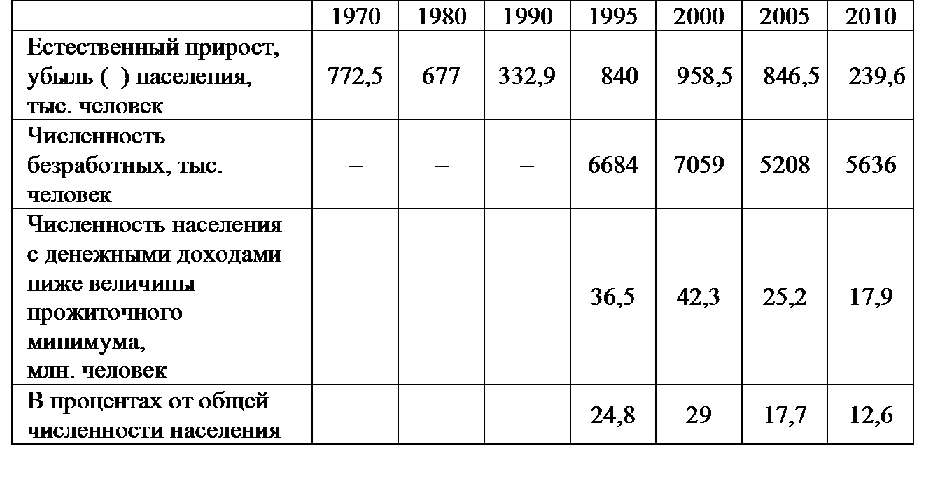 Я выбираю из официального статистического сборника, изданного Федеральной службой статистики в начале 2012 г., три важнейших показателя: прирост и убыль населения, число безработных и число лиц с душевым доходом ниже прожиточного минимума (табл. 2).