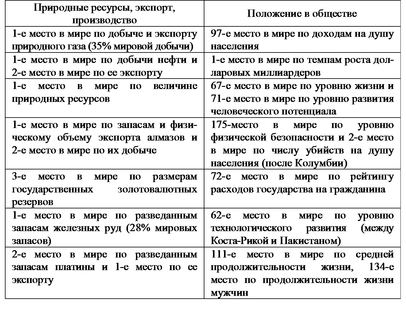 Еще более контрастную картину в канун президентских выборов 2012 г. рисовал один из кандидатов в президенты Г.А. Зюганов, ссылаясь на статистику ООН. Вот эти данные, позволяющие проводить сравнение между наличием природных и экономических ресурсов и реальным положением населения страны (табл. 3).