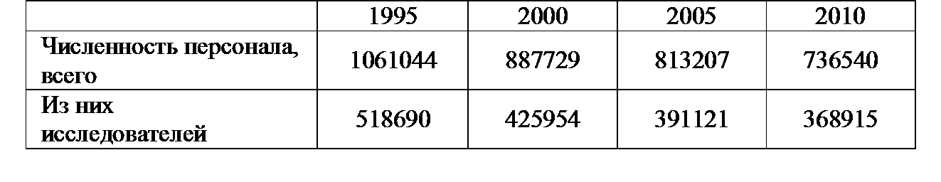 Из таблицы с очевидностью следует, что имело место постоянное уменьшение числа исследователей. Начиная с 1990‐х годов российская наука испытывала нарастающие трудности: снижалось ее финансирование, старело экспериментальное оборудование, наметился большой отток исследователей из России за рубеж, обострилась так называемая внутренняя эмиграция, т.е. уход ученых и разработчиков из науки в другие сферы деятельности, обеспечивавшие более высокий уровень заработной платы, более престижное положение в обществе. По данным Национальной ассоциации инноваций и развития информационных технологий НАИРИТ, в 2011 г. около 10 % российских научных работников, занятых исследованиями, желали бы работать в одной из европейских стран, около 20 % – в Китае, и только немногим более 50 % респондентов выказали желание заниматься разработкой своих проектов непосредственно в России.