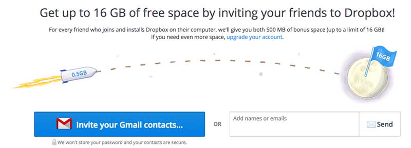 Рекомендательный маркетинг – самый действенный. 80 % людей склонны следовать советам и рекомендациям своих друзей и знакомых. Dropbox предложил пользователям пригласить друзей зарегистрироваться. За приглашение клиент Dropbox получал 16 ГБ облачного хранения данных бесплатно, а если его друг воспользовался предложением и создал аккаунт, они оба получали еще по 500 МБ. В результате количество пользователей Dropbox выросло со 100 000 до 4 000 000 за 15 месяцев, при этом 2,8 миллиона пользователей пришли по рекомендациям.