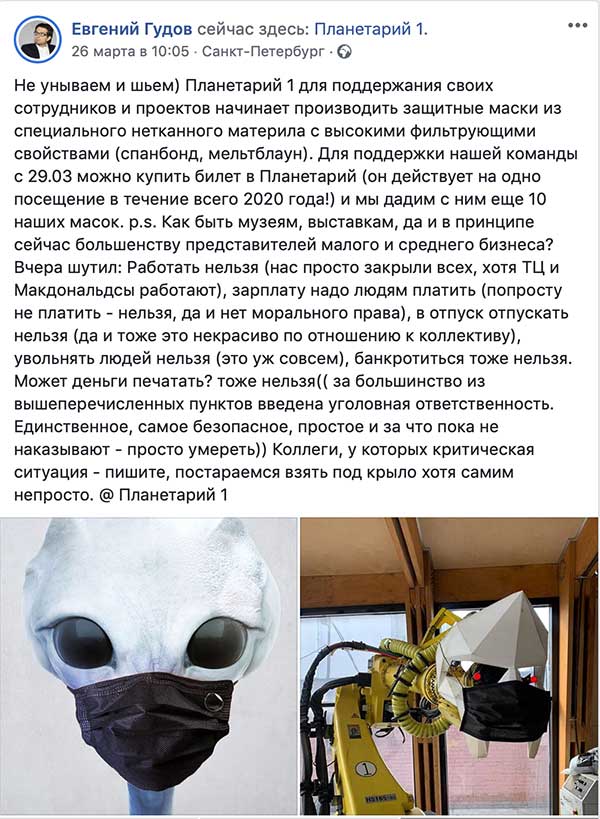 Планетарий 1 в Санкт-Петербурге был закрыт в связи с пандемией. Для поддержания своих сотрудников и помощи людям сотрудники решили шить медицинские маски из специального нетканого материала с высокими фильтрующими свойствами. Евгений Гудов, основатель и руководитель Планетария 1, пообещал подарить 10 масок тем людям, которые купят билет для посещения Планетария (действует до конца 2020 года). Медицинских масок сейчас просто не купить ни в Питере, ни в Москве. Поэтому это очень мощный и очень социально-предпринимательский ход.