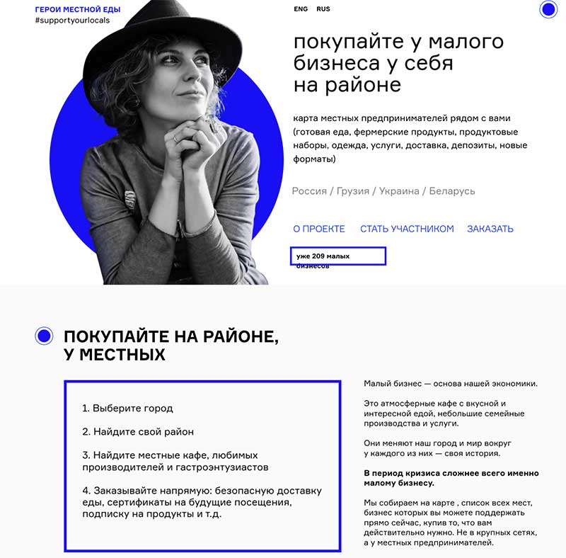 Портал «Местная еда» помогает рассказать своим посетителям о местных предпринимателях, создав свое сообщество героев. Заказывайте еду, подписку на продукты и сертификаты на будущее посещение, спасая 209 малых бизнесов по всей России.