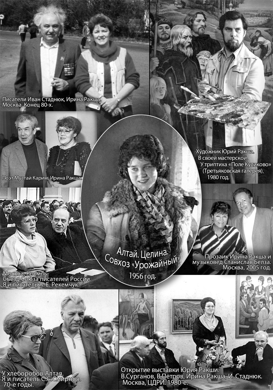 Ирина Евгеньевна Ракшá – писатель, кинодраматург, член Союза журналистов СССР и РФ (с 1965 г.), член Союза писателей СССР и РФ (с 1969 г.). Вдова художника Юрия Ракши (1937–1980), их совместная дочь Анна Юрьевна (1965–2017) была членом Союза художников РФ.