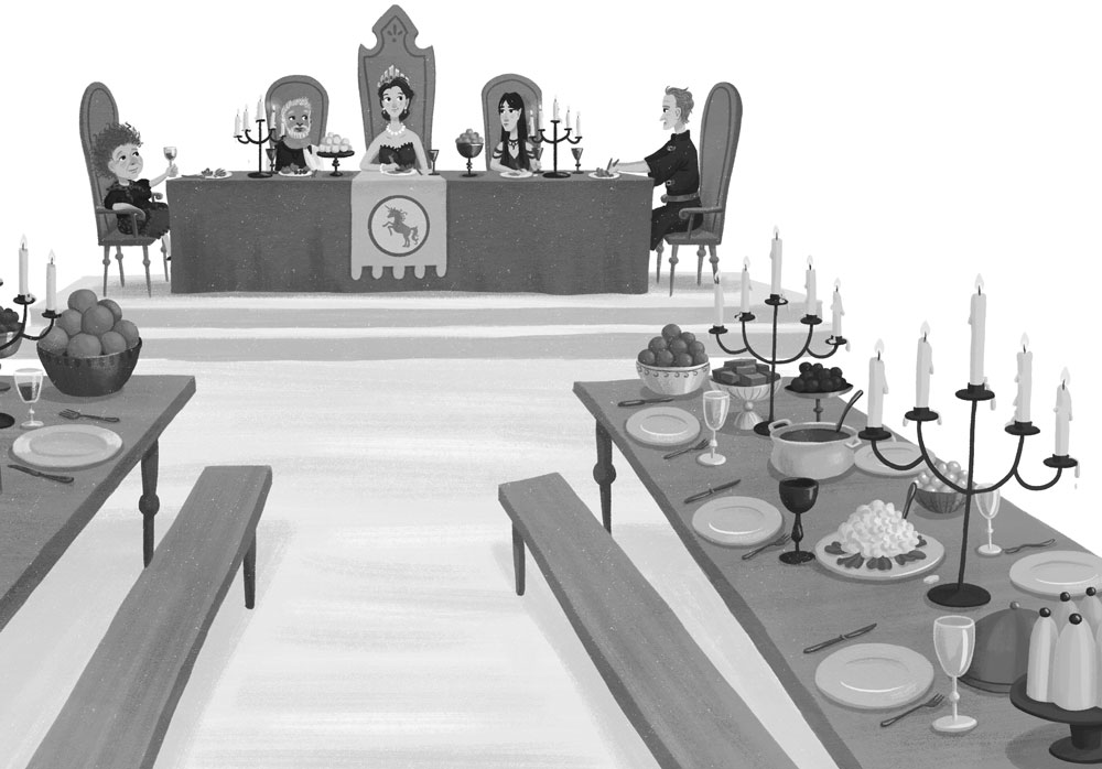 Сегодня столы просто ломились от тарелок и блюд с изысканными яствами. Вокруг королевы Бернадетты сидели сэр Конрад и другие советники и советницы, что выглядело странно, ведь обычно все рассаживались за столами без особых правил и церемоний. А кто эта раздражённая молодая особа с длинными чёрными волосами рядом с королевой?