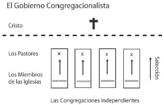 En el sistema “congregacionalista”, normalmente usado por ejemplo en las iglesias Bautistas, la autoridad y el poder descansan en la congregación misma. La congregación selecciona quién va a ser su pastor. Note en la figura que las flechas van en un solo sentido, hacia arriba. No hay autoridades humanas por sobre la congregación, ni grupo ni individuo. Cada congregación es independiente. Las ventajas del sistema congregacionalista son que permite la libertad de la congregación e incluye la participación de los miembros.