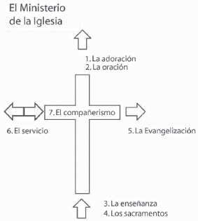 Para visualizar estos siete aspectos, podríamos usar la figura de una cruz, simbolizando el hecho de que el ministerio de Jesús es el ministerio de cada creyente y de la Iglesia. Somos Su Cuerpo.