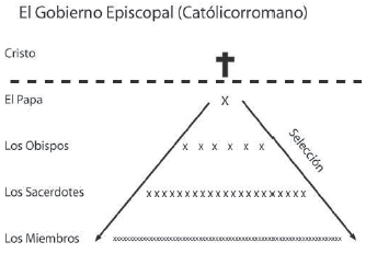 La estructura “episcopal” tiene una jerarquía de autoridad. En este sistema, la congregación no selecciona quién va a ser su pastor o sacerdote, sino las autoridades superiores, que normalmente son llamados obispos (ἐπίσκοπος, “epískopos”, en griego, significa “supervisor”). La Iglesia Católica Romana es el ejemplo más notable de esta estructura, en que el Papa es la máxima autoridad. La Iglesia Ortodoxa Griega, la Iglesia Luterana, la Iglesia Metodista y la Iglesia Anglicana, también son consideradas “episcopales” en su forma de gobierno. La siguiente figura ilustra la estructura “episcopal”. Observe las flechas que indican que el proceso de selección va en una sola dirección, de arriba a abajo. Las ventajas del sistema episcopal son que demuestra unidad y anima mayor rendición de cuentas.