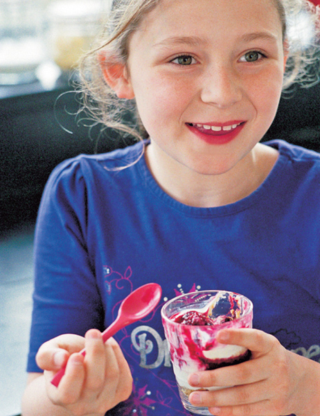 3 Place a 1cm/½ inch layer of crushed digestives into the bottom of each glass. Spoon 1cm/½ inch of the Greek yoghurt on top, followed by 1cm/½ inch of the fruit. Repeat this so you have 6 layers in total (2 of each). Serve immediately or refrigerate for later.